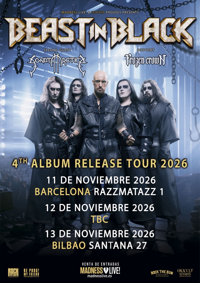 El metal más épico y melódico del norte de Europa aterriza el próximo otoño en España con una noche que promete hacer historia. Los finlandeses Beast In Black regresan como cabeza de cartel, acompañados por los invitados especiales Sonata Arctica y los italianos Frozen Crown como banda de apertura. Dos citas imprescindibles para los amantes del power metal: 11 de noviembre en la Razzmatazz 1 de Barcelona y 13 de noviembre en la Santana 27 de Bilbao.